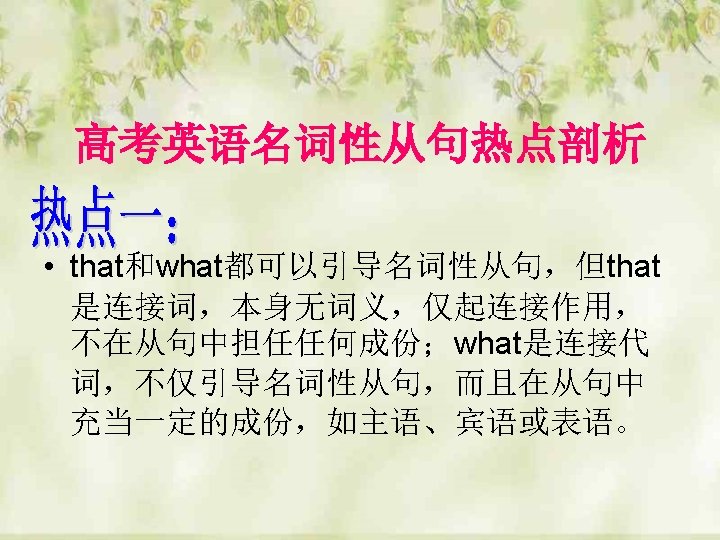 • • • 引导主语从句,表语从句,宾语从句: whoever=anyone whomever=anyone whom whosever=anyone whose whatever=anything that whichever=anything that