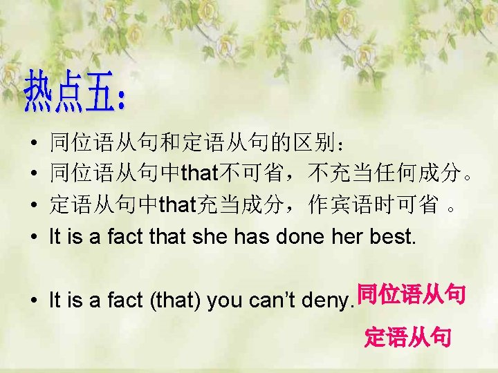 • 虚拟语气:与“命令、要求、建议”等相关的 名次性从句中常用虚拟语气“should +v. ” • She suggested we go on foot. • We didn’t agree with her suggestion that we go on foot.