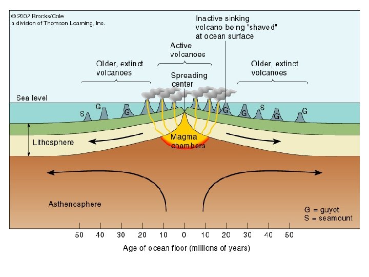 Deep-Ocean Basins Seamounts are volcanic projections from the ocean floor that do not rise above sea level (underwater volcanoes). • Associated with hot spots and mid-ocean ridges If seamounts break the surface of the ocean, they create volcanic islands • The biggest mountain on earth is Mauna Loa (Hawaii). © 2002 Brooks/Cole, a division of Thomson Learning, Inc.