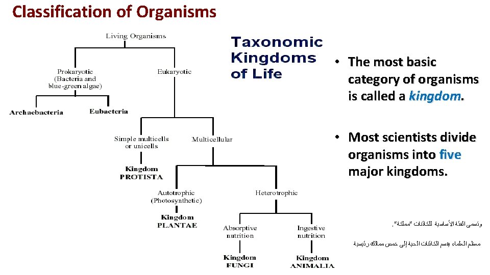Taxonomic Hierarchy Species: • Organisms sharing a set of biological traits and reproducing only their exact kind. ( )ﺍﻟﻨﻮﻉ ﻫﻮ ﺍﻟﻮﺣﺪﺓ ﺍﻷﺴﺎﺳﻴﺔ ﻓﻲ ﺍﻟﺘﺼﻨﻴﻒ. ﻣﺠﻤﻮﻋﺔ ﻣﻦ ﺍﻟﻜﺎﺋﻨﺎﺕ ﺍﻟﺤﻴﺔ ﺗﺸﺘﺮﻙ ﻓﻲ ﻣﺠﻤﻮﻋﺔ ﻣﻦ ﺍﻟﺼﻔﺎﺕ ﺍﻟﺤﻴﻮﻳﺔ ﻭﻟﻬﺎ ﺍﻟﻘﺪﺭﺓ ﻋﻠﻰ ﺍﻟﺘﺰﺍﻭﺝ ﻓﻴﻤﺎ ﺑﻴﻨﻬﺎ • Species is the fundamental unit in taxonomy Genus: Closely related species Family : Closely related genera Order : Closely related families Class : Closely related order Phylum : Related classes