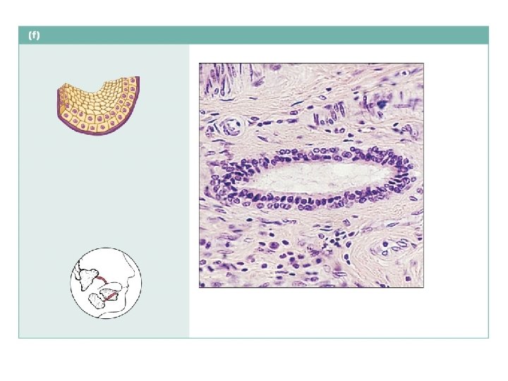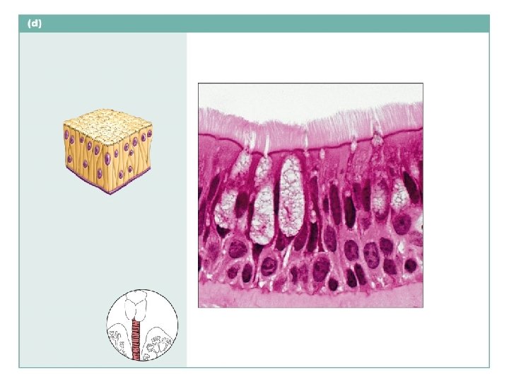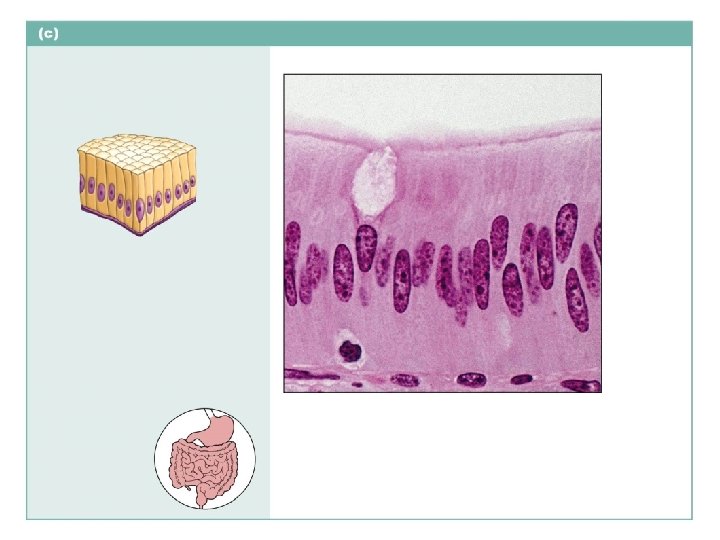 Simple columnar epithelium Description: Single layer of tall cells with round to oval nuclei; some cells bear cilia; layer may contain mucus-secreting unicellular glands (goblet cells). Microvilli Goblet cell Simple columnar epithelial cell Function: Absorption; secretion of mucus, enzymes, and other substances; ciliated type propels mucus (or reproductive cells) by ciliary action. Location: Nonciliated type lines most of the digestive tract (stomach to anal canal), gallbladder, and excretory ducts of some glands; ciliated variety lines small bronchi, uterine tubes, and some regions of the uterus. Basement membrane Photomicrograph: Simple columnar epithelium of the small intestine (650 ).