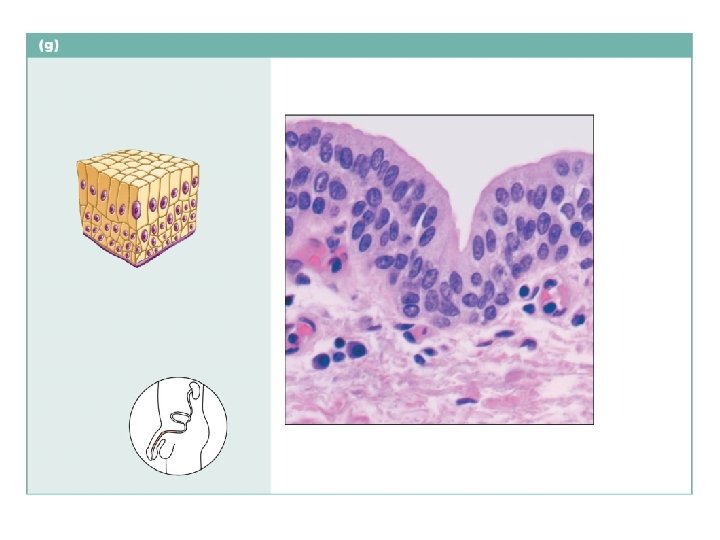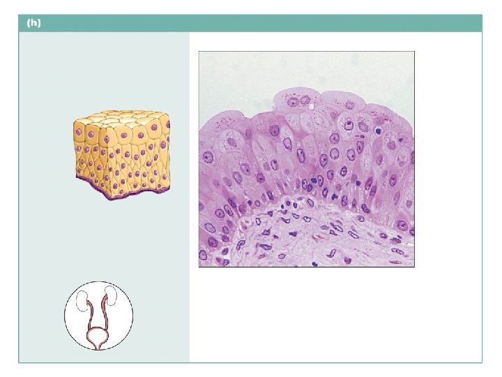 Transitional epithelium Description: Resembles both stratified squamous and stratified cuboidal; basal cells cuboidal or columnar; surface cells dome shaped or squamous-like, depending on degree of organ stretch. Transitional epithelium Function: Stretches readily and permits distension of urinary organ by contained urine. Location: Lines the ureters, bladder, and part of the urethra. Photomicrograph: Transitional epithelium lining the bladder, relaxed state (365 ); note the bulbous, or rounded, appearance of the cells at the surface; these cells flatten and become elongated when the bladder is filled with urine. Basement membrane Connective tissue