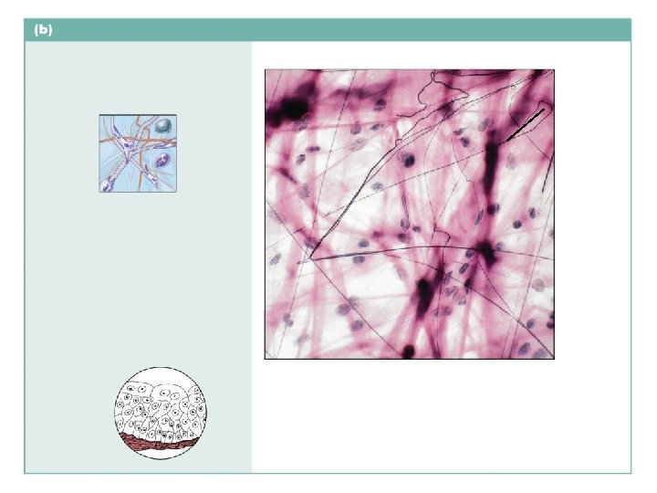 loose areolar connective tissue Description: Gel-like matrix with all three fiber types; cells: fibroblasts, macrophages, mast cells, and some white blood cells. Elastic fibers Ground substance Function: Wraps and cushions organs; its macrophages phagocytize bacteria; plays important role in inflammation; holds and conveys tissue fluid. Fibroblast nuclei Collagen fibers Location: Widely distributed under epithelia of body, e. g. , forms lamina propria of mucous membranes; packages organs; surrounds capillaries. Photomicrograph: Areolar connective tissue, a soft packaging tissue of the body (340 ). Epithelium Lamina propria