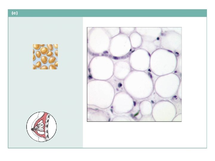 Adipose connective tissue (fat) Description: Matrix as in areolar connective tissue, but very sparse; closely packed adipocytes, or fat cells, have nucleus pushed to the side by large fat droplet. Nucleus of fat cell Function: Provides reserve food fuel; insulates against heat loss; supports and protects organs. Vacuole containing fat droplet Location: Under skin in the hypodermis; around kidneys and eyeballs; within abdomen; in breasts. Adipose tissue Photomicrograph: Adipose tissue from the subcutaneous layer under the skin (350 ). Mammary glands