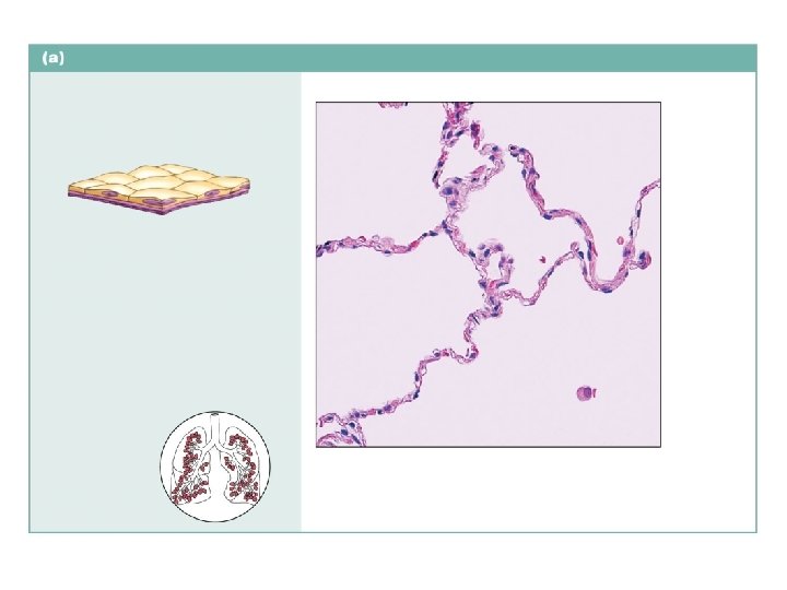 Simple squamous epithelium Description: Single layer of flattened cells with disc-shaped central nuclei and sparse cytoplasm; the simplest of the epithelia. Function: Allows passage of materials by diffusion and filtration in sites where protection is not important; produces lubricating fluid in serosae. Air sacs of lung tissue Nuclei of squamous epithelial cells Location: Kidney glomeruli; air sacs of lungs; lining of heart, blood vessels, and lymphatic vessels; lining of ventral body cavity (serosae). Photomicrograph: Simple squamous epithelium forming part of the alveolar (air sac) walls (140 ).