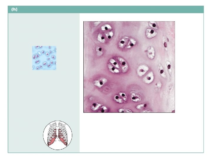 Cartilage: hyaline Description: Amorphous but firm matrix; collagen fibers form an imperceptible network; chondroblasts produce the matrix and, when mature (chondrocytes), lie in lacunae. Chondrocyte in lacuna Matrix Function: Supports and reinforces; serves as resilient cushion; resists compressive stress. Location: Forms most of the embryonic skeleton; covers the ends of long bones in joint cavities; forms costal cartilages of the ribs; cartilages of the nose, trachea, and larynx. Costal cartilages Photomicrograph: Hyaline cartilage from a costal cartilage of a rib (470 ).