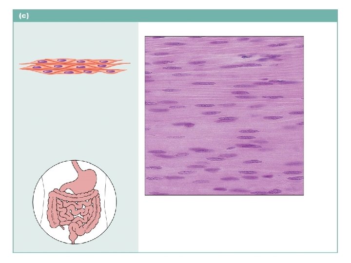 Smooth muscle Description: Spindle-shaped cells with central nuclei; no striations; cells arranged closely to form sheets. Smooth muscle cell Function: Propels substances or objects (foodstuffs, urine, a baby) along internal passageways; involuntary control. Nuclei Location: Mostly in the walls of hollow organs. Photomicrograph: Sheet of smooth muscle from the digestive tract (465 ).