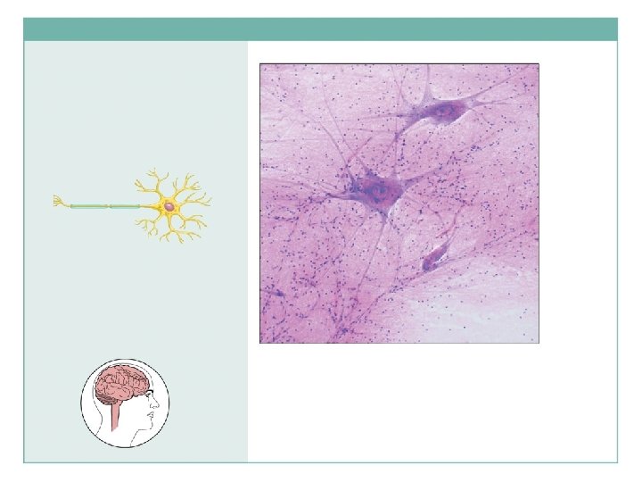 Nervous tissue Description: Neurons are branching cells; cell processes that may be quite long extend from the nucleus-containing cell body; also contributing to nervous tissue are nonconducting supporting cells, neuroglia (not illustrated). Neuron processes Cell body of a neuron Neuron processes Cell body Dendrites Axon Function: Transmit electrical signals from sensory receptors and to effectors (muscles and glands) that control the activity of the effector organs. Location: Brain, spinal cord, and nerves. Nuclei of neuroglia Photomicrograph: Neurons (125 ).