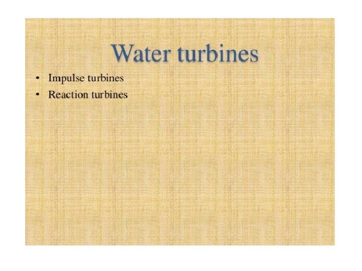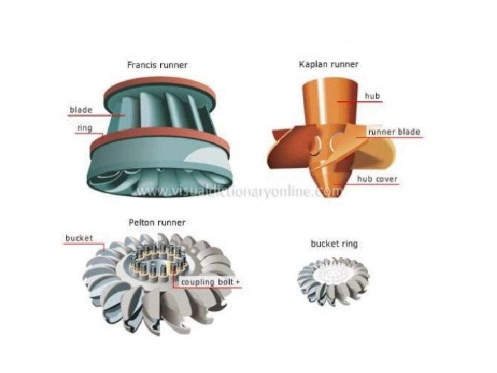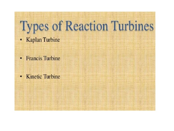 • Classification of Turbines Steam Turbines Impulse Turbines Reaction Turbines Hydraulic Turbines Impulse-Pelton Turbines Reaction. Kaplan Turbines Reaction-Francis Turbines Gas Turbines Open Cycle Gas Turbines Closed Cycle Gas Turbines