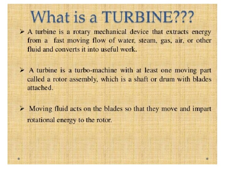 • Steam Turbines: • A steam turbine is a thermo-mechanical device that extracts thermal energy from pressurized steam, and converts it into rotary motion.