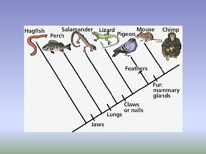 Cladograms • A diagram that shows evolutionary relationships • Cladograms are useful tools • Help scientists understand how one lineage branched from another in the course of evolution • Derived characters = characteristics that appear in recent lineage but not in older members…used to construct cladograms