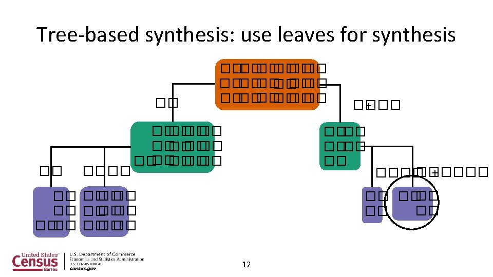 Tree-based synthesis: grow the tree �� �� ���� �� �� �� �� �� �� �� �� ���� + ���� �� We limit minimal split/leaf size to: Avoid overfitting Allow plausible synthesis 11 ������ + ���� �� ��