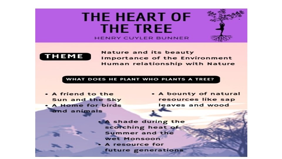Introduction: The Heart of the Tree by the American poet and novelist Henry Cuyler Bunner is a fine piece of poetry with a simple theme and a simpler structure. The poem was originally published in 1912. Planting a tree is always a great work for the mankind. But, the poet has found out new ways to look at the plants and plantation.