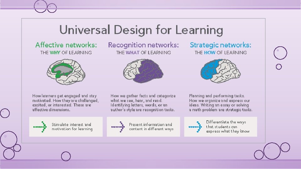 Research shows……. o Changes in classroom environmental arrangement, such as rearranging furniture, implementing activity schedules, and altering ways of providing instructions around routines, have been found to increase the probability of appropriate behaviors and effectively decrease the probability of challenging behaviors. (Chandler et al. , 1999; Dooley, Wilczenski, & Torem, 2001; Martens, Eckert, Bradley, & Ardoin, 1999) o Neuroscience continues to inform us about how the brain functions and what this means for effective teaching and, more importantly, effective learning. We know: o Why emotionally connecting with our students is crucial to their learning experience. o What is the importance of connecting new information with prior knowledge. o How using art to engage multiple senses results in increased cognition and recall.