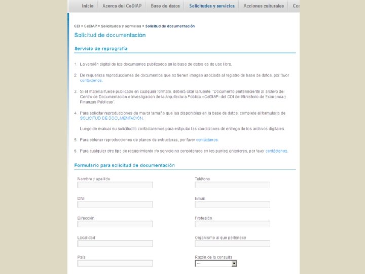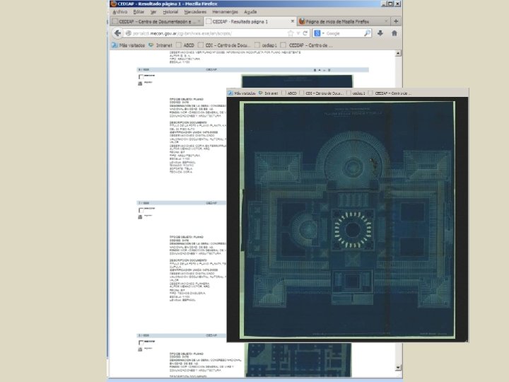 Evolución del Proyecto Ce. DIAP Instancia Fundacional Misión programa Ce. DIAP considerandos de la Resolución: “. . . la protección de este patrimonio documental, . . . preservar la memoria institucional de la Nación respecto a su arquitectura oficial, . . . la defensa del Patrimonio Nacional. . . “ USOS Y COSTUMBRES: investigación-análisis Usuarios: funcionarios – algunos investigadores Reproducciones para usos diversos: copias heliográficas Preservación: microfilms RECURSOS DISPONIBLES, POTENCIALIDAD DE USOS: investigacióndiagnóstico Apertura a la consulta pública Ideas innovadoras, recursos de la tecnología informática de incipiente uso masivo El entorno, instituciones y profesionales vinculados a la gestión de información Alianzas estratégicas, Biblioteca Nacional Apoyo institucional