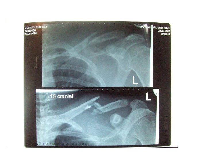 Surgery • More than 90% of clavicle fractures are successfully healed by non-operative treatment. The surgery is indicated when one or more of the following conditions presents. • Comminution with separation (multiple piece) • Significant Foreshortening of the clavicle (indicated by shoulder forward). • Skin penetration (Open Fracture). • Clearly associated nervous and vascular trauma (Brachial Plexus or Supra Clavicular Nerves). • Non Union after several months (3– 6 months, typically) • Distal Third Fractures which interfere with normal function of the ACJ (Acriomio Clavicular Joint).