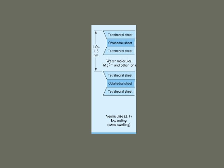 1. Silicate Clays ü Still have very high net negative charge ü High CEC (highest of all clays) ü Expandable ü Octahedral ions are Al, Mg, Fe ü Surface area 600 – 800 m 2/g üInternal >> external