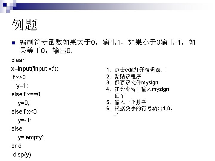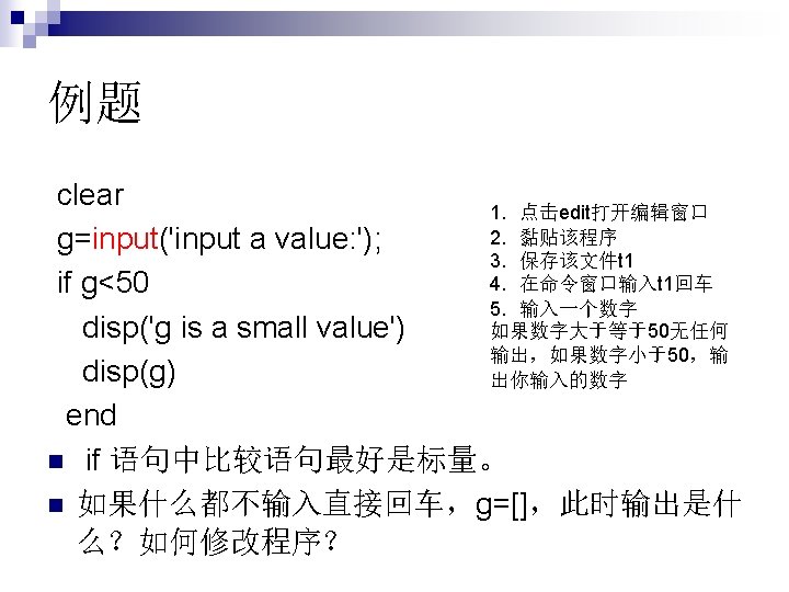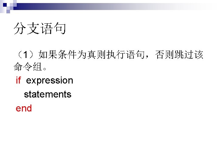 If elseif else end (3)如果可供选择的命令多余 2组 if expression 1 command 1 elseif expression 2 command 2 elseif expression 3 command 3 … else commandn end