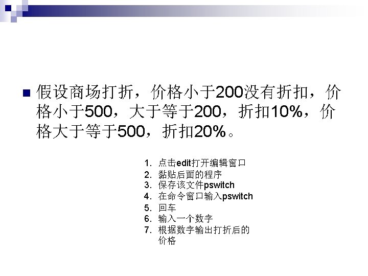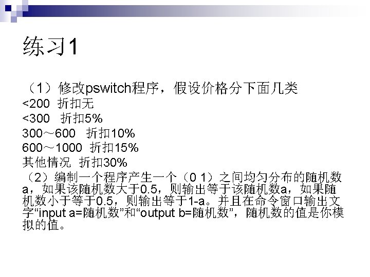 程序pswitch price=input('please input the price: ') switch fix(price/100) case {0, 1}%matlab会把数值与cell数组中的所有的值进行比较,如果 为真则执行该命令。 rate=0 case {2, 3, 4} rate=0. 1 otherwise rate=0. 2 end price=price*(1 -rate); final=strcat('the final price is: ', num 2 str(price)); disp(final)