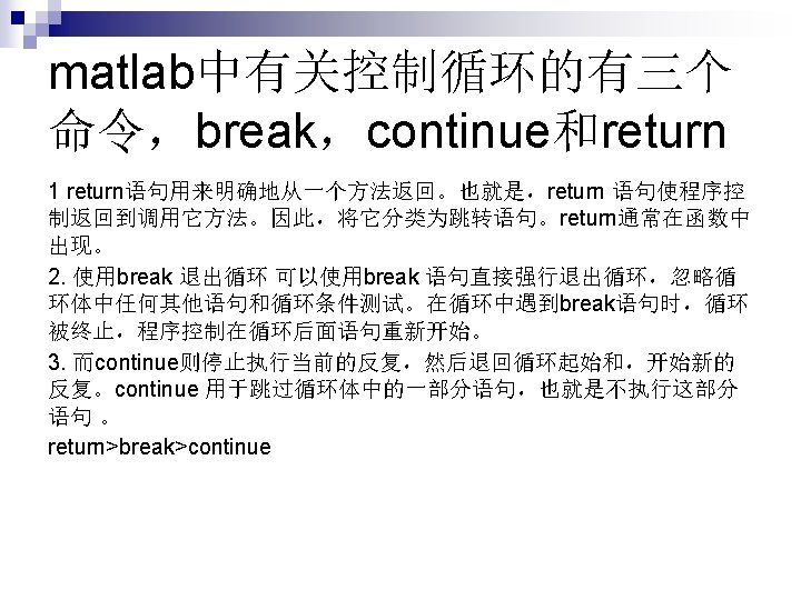 观察比较三者的区别 for i=1: 4 if i==2 %continue %break return end disp(['i=', num 2 str(i)]) end disp(['last number is: ' num 2 str(i)])
