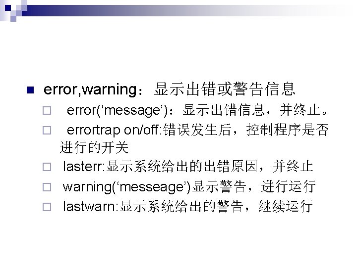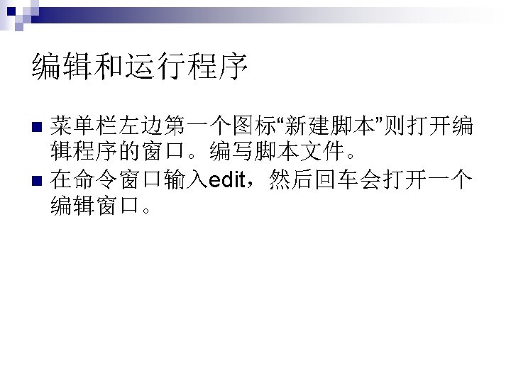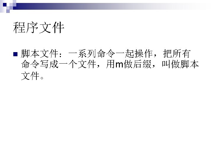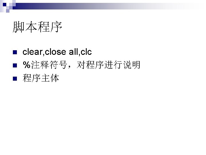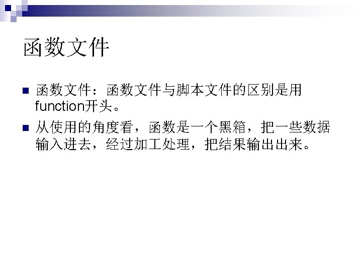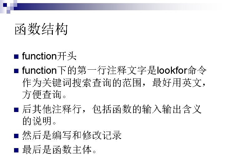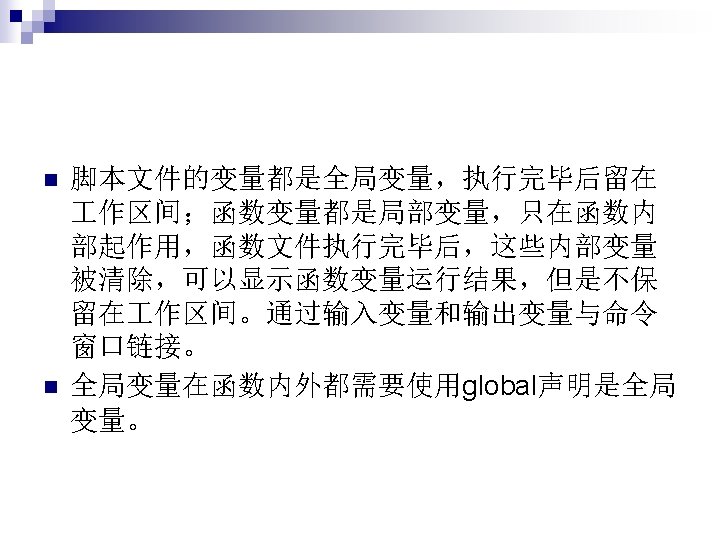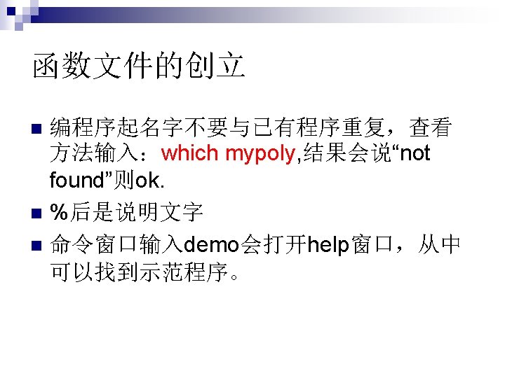 函数没有输入输出, 例如star,这时类似于脚 本文件。 function []=star 1() theta=pi/2: 0. 8*pi: 4. 8*pi; r=ones(1, 6); polar(theta, r) n