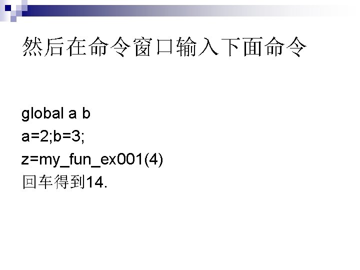 全局变量 function f=my_fun_ex 001(x) global a b; f=a+b*x;