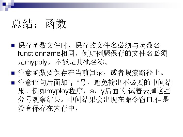 编制一个函数文件 function y=mypoly(x) % this function calculates the value of a third order polynomial %x 可以是矩阵 %最新修改 10月31日 a=3*x. ^3+5*x. ^2 -2*x+1; %注意点乘的用 法 y=a; end