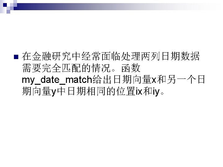 my_date_match函数 function [common_date, ix, iy]=my_date_match(x, y) %input: x and y are date vectors, respectively %output: ix is number of row which makes the ixth number in x equals the %iyth number in y; common_date is the common dates in both x and y if length(unique(x))~=length(x) error('there are some repeated dates in x') end if length(unique(y))~=length(y) error('there are some repeated dates in y') end [common_date, ix, iy]=intersect(x, y);