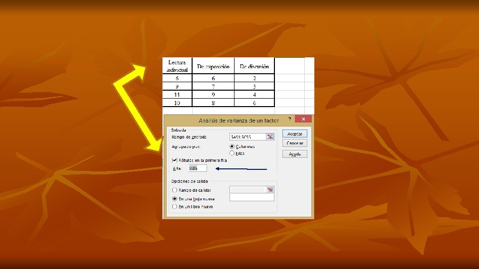 n n Si cuenta con rótulos en la primera fila active la casilla correspondiente. El valor de alfa que da la función de ANOVA I, es de 0. 05, pero puede cambiarla escribiendo en el campo el valor deseado.