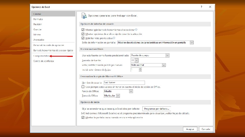 n En la nueva ventana que aparece n Complementos n Elige la opción Herramientas para análisis. n Presiona el botón aceptar.