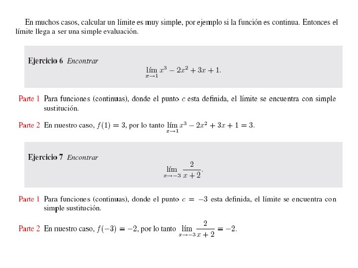2. - Resolver el límite Solución: La solución no es tan inmediata como en el caso anterior, es necesario realizar algunas operaciones antes de aplicar el límite, ya que este límite nos conduce a la indeterminación del tipo cero sobre cero. Para su solución existen dos métodos: Por lo que aplicando la factorización: