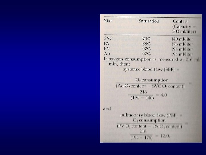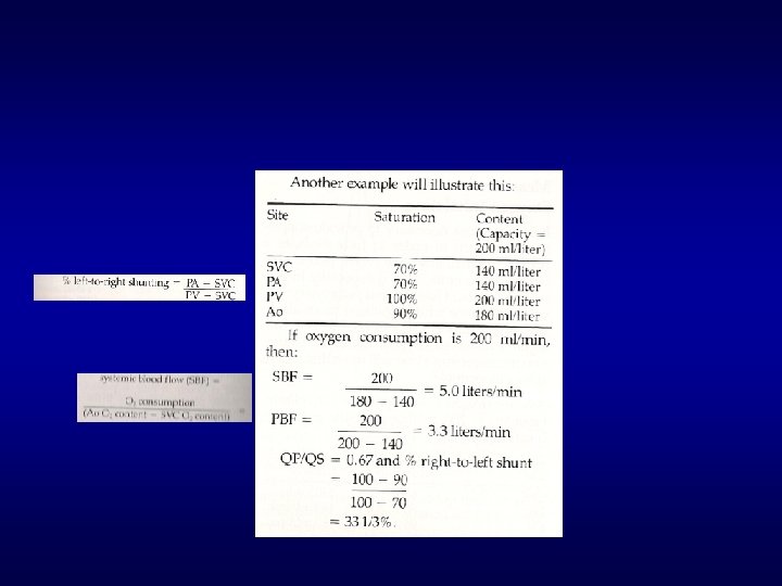 • Cvp. O 2: 0, 96 x 14 x 1, 36 = 183 ml/l • Cap. O 2: 0, 8 x 14 x 1, 36 = 152 ml/l • Qp: VO 2/ Cvp – Cap = 240/183 -152 = 7, 74 l/min • Qs: VO 2/Cao. O 2– Cvm. O 2 = 4, 7 l/min • Shunt = Qp-Qs: 7, 74 -4, 7 = 3 l/min • Razão de fluxo: Qp/Qs=1, 65(DSA pequena a moderada)