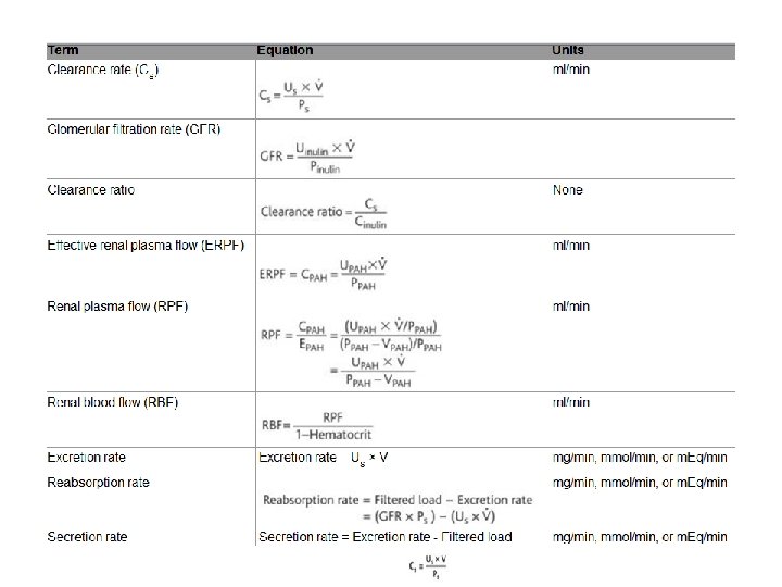 Clearance • Clearance is a general concept that describes the rate at which substances are removed (cleared) from the plasma. • Renal clearance of a substance is the volume of plasma completely cleared of a substance per min by the kidneys.