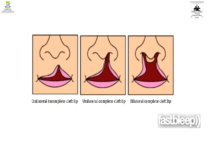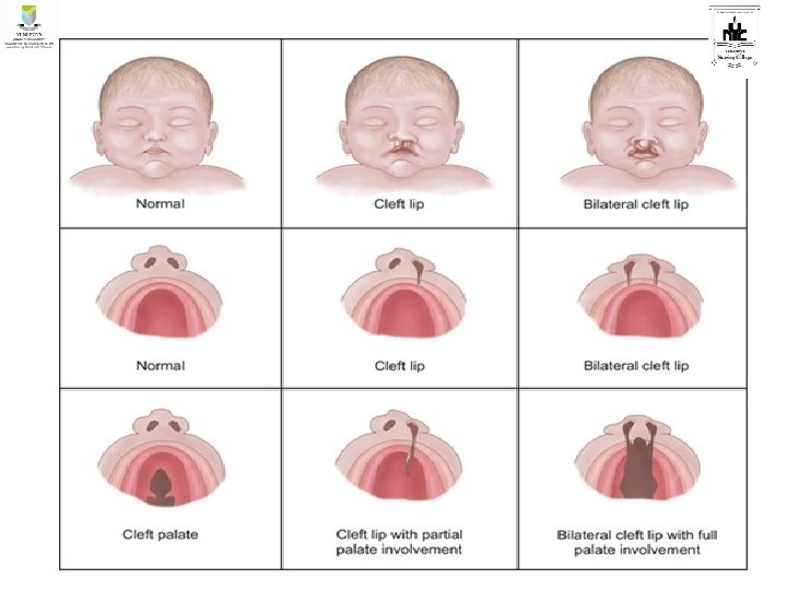 • Assess for problems with feeding, breathing parental bonding, and speech. • Ensure adequate nutrition and prevent aspiration. a. Provide special nipples or feeding devices (e. g. , soft pliable bottle with soft nipple with enlarged opening) for a child unable to suck adequately on standard nipples. b. Hold the child in a semi-upright position; direct the formula away from the cleft and toward the side and back of the mouth to prevent aspiration. c. Feed the infant slowly and burp frequently to prevent excessive swallowing of air and regurgitation. d. Stimulate sucking by gently rubbing the nipple against the lower lip.