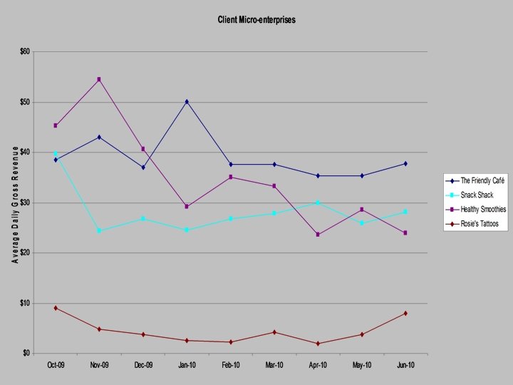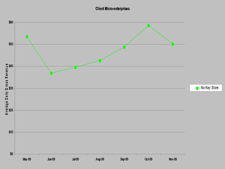Timeline Feb. 2009 – Training series #1 graduates 12 clients n May 2009 – Three enterprises open n Jul. 2009 – Training series #2 and #3 graduates 6 clients n Aug. 2009 – One enterprise fails and closes n