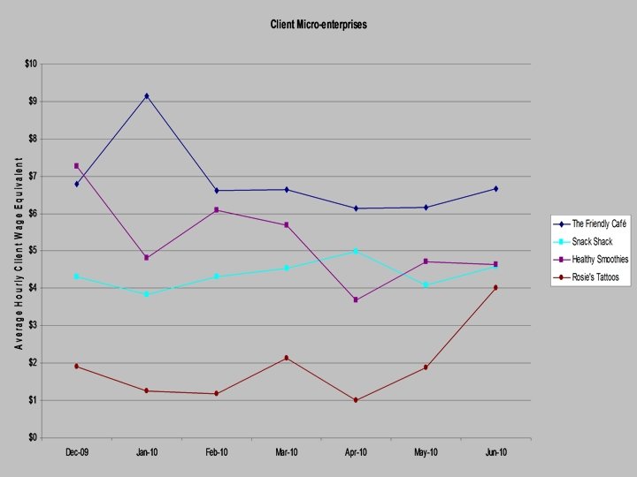 Timeline Oct. 2009 – Four new enterprises open n Dec. 2009 – One enterprise closes because client secured paid employment n May 2010 – The Friendly Café open for 12 months n Jul. 2010 – Training series #4 graduates 3 clients n