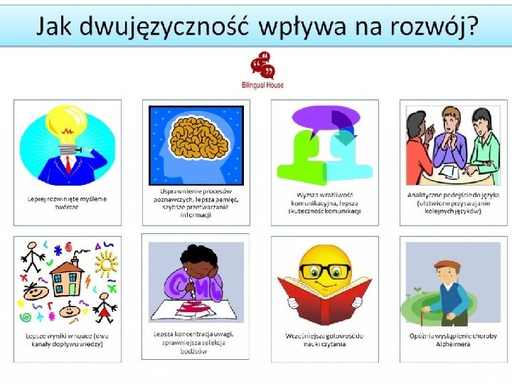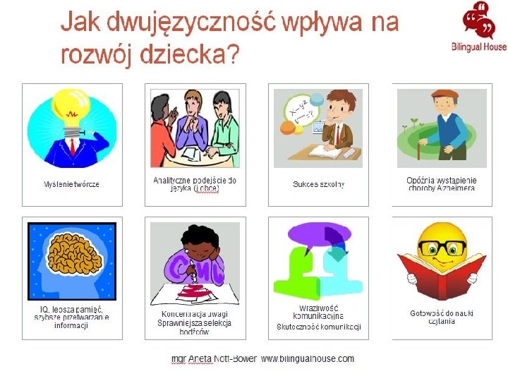 ZALETY NAUCZANIA DWU I WIELOJĘZYCZNEGO Taka nauka pozytywnie działa nie tylko dla poszerzania wiedzy z innego języka, ale działa również pozytywnie na język ojczysty Mózg dziecka uczącego się dwujęzycznie lepiej radzi sobie z wykonaniem obliczeń, niż dziecko jednojęzyczne Zaobserwowano także, że dzieci uczące się dwujęzycznie miały lepsze wyniki z matematyki