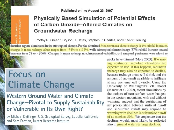 Groundwater Response to Climate Change - II • • Computer simulations are inconclusive Lack tools and data to predict groundwater responses to climate change with confidence Groundwater recharge papers (Green et al. , 2007; Dettinger and Earman, 2007): aquadoc. typepad. com/waterwired/2007/09/cli mate-change-. html Groundwater-fed streams – response to climate change: aquadoc. typepad. com/waterwired/2007/10/ariver-for-war. html
