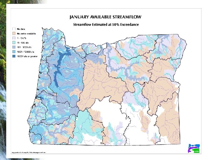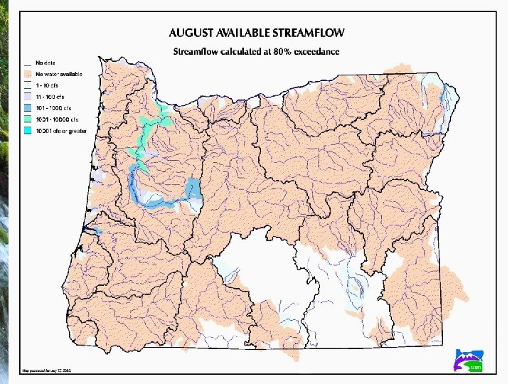 Oregon Water Status Report - 1 S Government must deal with water quantity and water quality issues as growth is projected to increase by nearly 41% in Oregon by 2030 (more if we have climate refugees). S Most stream systems in Oregon have been heavily modified to achieve various flood control, agricultural irrigation, navigation, hydropower, recreation, and M&I water supply benefits. S Oregon’s water supply is generally fully-allocated and in places, over-allocated, during the low flow summer and fall months. Instream flow needs and flows do not always correspond. S Relative dependence on groundwater in the Willamette Valley and Columbia Plateau region make quality and quantity of groundwater a special concern in these regions.