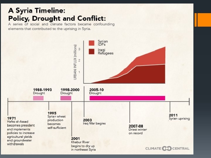 Levels of Climate Change Effects in Syria First Level: § Changes in § physical environment § § Example: higher temperatures Second Level: Effect on ecological systems Example: droughts, desertification Third Level: Fourth Level § Effects from human § Effect on human responses systems § Examples: § Example: severe stress on agriculture, Inadequate policy responses, mass food security migrations, conflict
