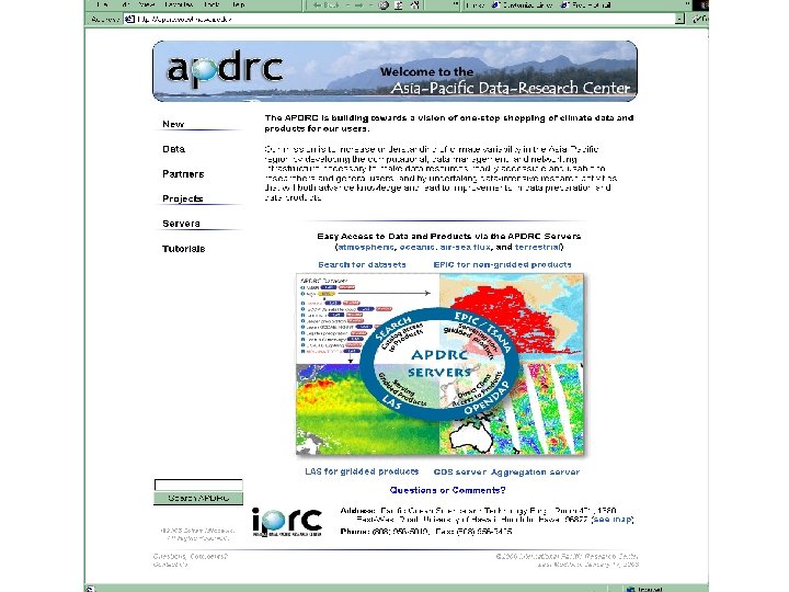 The APDRC was established within the IPRC to be a climate data and web-based product serving facility. Our mission is to increase understanding of climate variability in the Asia-Pacific region by: • developing the computational, datamanagement, and networking infrastructure necessary to make data resources readily accessible and usable by researchers and other users; • undertaking data-intensive research activities that will both advance knowledge and lead to improvements in data collection and preparation.