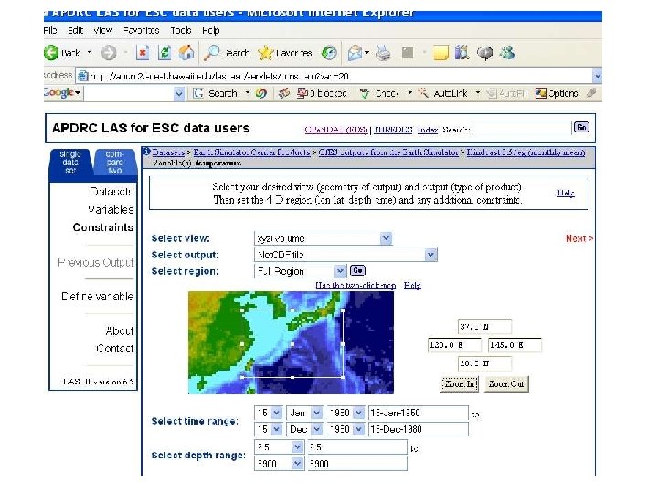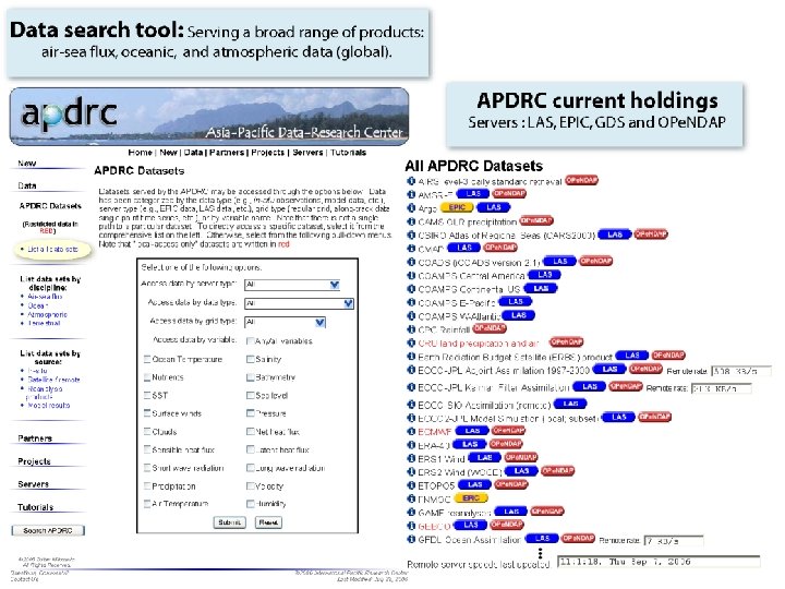APDRC Customers Scientific users: ● direct access to data ● typically large (long timeseries and/or large spatial extents Server technology >> interface/presentai Non-scientific users: ● Plot generation ● More co-ordinated approach Web interface >> data format/server tech