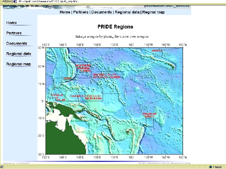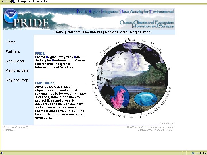 Conceptual Framework for US/NOAA Context PRIDE Bi-Laterals IPRC APDRC New NOAA Facility in Hawaii Global/Regional Observations GCOS/GOOS/IOOS with Australia Japan New Zealand Pacific Services Center PRIDE Pacific Climate Information System WMO/NOAA RCCs RISA NOAA Data Centers