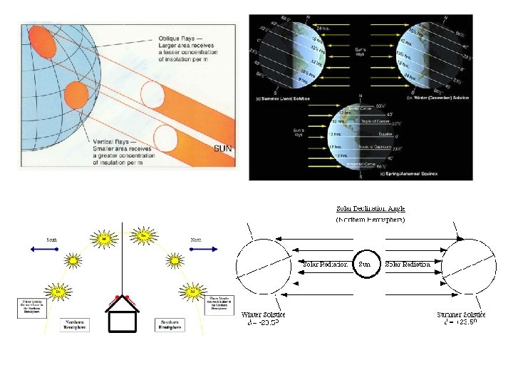 II. Angle of Insolation- the higher the angle the more intense the energy A. Depends on latitude, season and time of day. B. Latitude- the suns rays are most intense in the tropics 1. 23 1/2 0 N (Tropic of Cancer) to 23 1/2 0 S (Tropic of Capricorn) -only in the tropics will the suns rays be directly overhead. 2. As your latitude increases the angle of the suns rays decrease