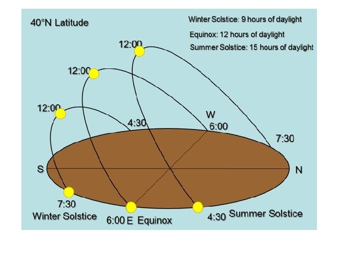 C. At sunrise an sunset the angle is lowest and it will be highest at noon for any location. D. The angle of the suns rays are highest on the first day of summer and lowest on the first day of winter. E. The duration of insolation-the length of time the sun is above the horizon varies with latitude and season. 1. Throughout the year the average of the total duration of insolation is always equal. 2. During the summer the duration of insolation is greater than the winter. -on the equinox there is equal duration of day and night. VID