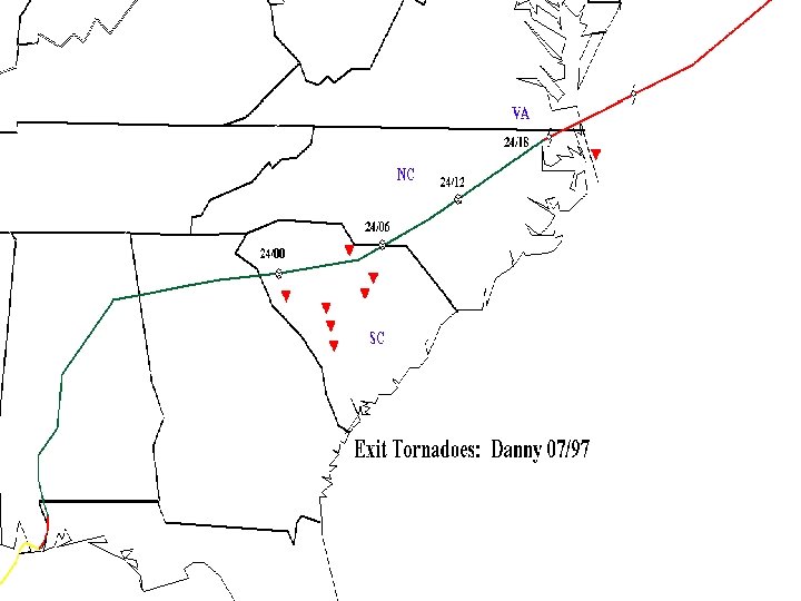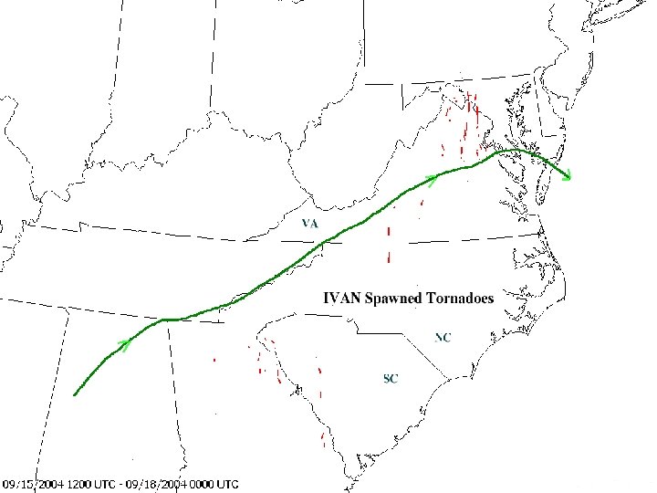Exit Tor Characteristics Cont • Ivan-51 Tors across the Virginias/Carolinas on 9/17/04 including F 1 -F 2 Tors in Bedford/Henry/Franklin/Campbell Ctys in VA and Rockingham/Guilford Ctys in NC • Cindy-15 Tors producing F 0 -F 1 damage in NC/VA on 7/7/05 • Earl-5 Tors in coastal SC resulting in 1 fatality and strong F 2 damage during morning of 9/4/98