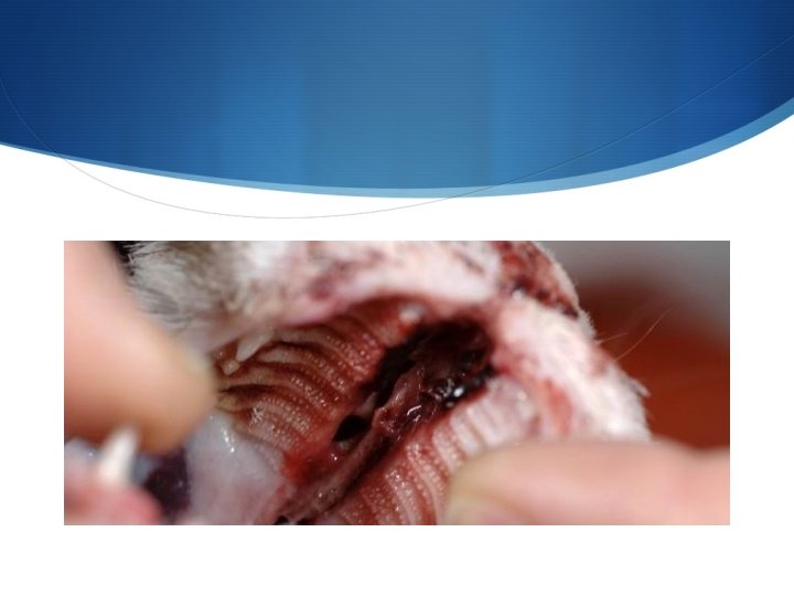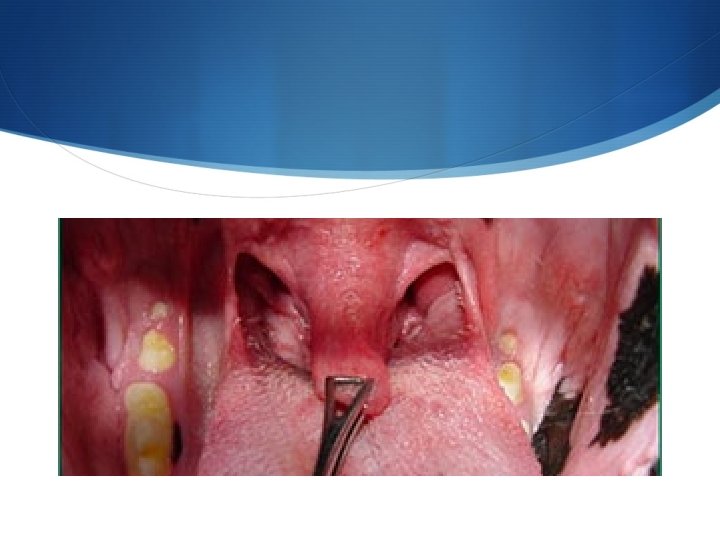S Esame delle cavità nasali – ispezione (segue) S Carattere dell’essudato Catarrale, ematico, purulento: in corso di rinite, patologia da corpo estraneo. La presenza di alimento può indicare palatoschisi oppure fistola oronasale. S Scolo francamente ematico (epistassi): in caso di neoplasia, nelle lesioni traumatiche con fratture dell’osso nasale o, talvolta, in caso di corpi estranei. Nel caso di corpi estranei si associa SEMPRE sternuto incoercibile e continuo nei primi giorni E’ NECESSARIA UNA DIAGNOSI PRECOCE PER IL RISCHIO …… L’epistassi si può verificare anche nei casi di affezioni sistemiche determinano trombocitopenia (Ehrlichia) o difficoltà della coagulazione (avvelenamenti). In caso di epistassi, nel cane, si deve tener conto, nella diagnosi differenziale, anche di affezioni di origine micotica (Aspergillosi) MA QUESTE ULTIME SI DENOMINANO ERRONEAMENTE TURBINATOPATIE , o parassitarie (Linguatula, Capillaria). S Quantità L’essudato può essere scarso, abbondante, intermittente. Questo parametro va valutato in relazione alla specie ed alla diversa tendenza del lambimento dell’essudato.