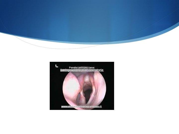 DIAGNOSI S ENDOSCOPIA S Laringoscopia anche non strumentale S Difficile da sveglio (solo se di indole MOLTO MANSUETA) S Con anestesia leggera per non inibire i movimenti laringei