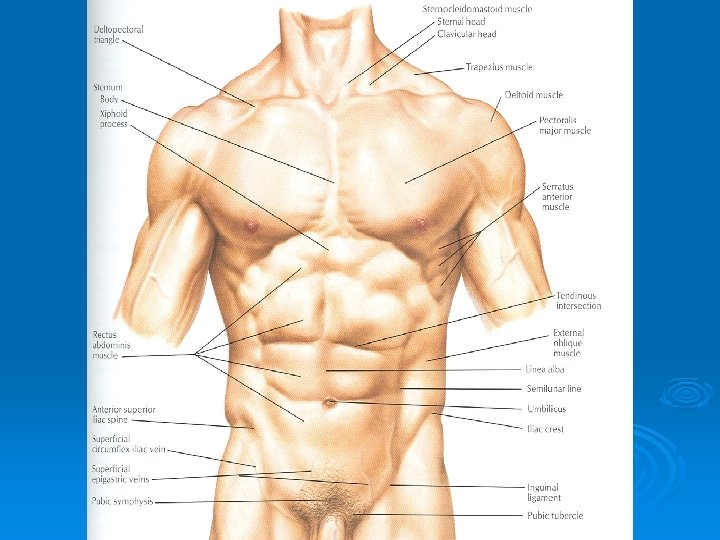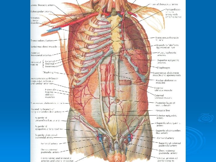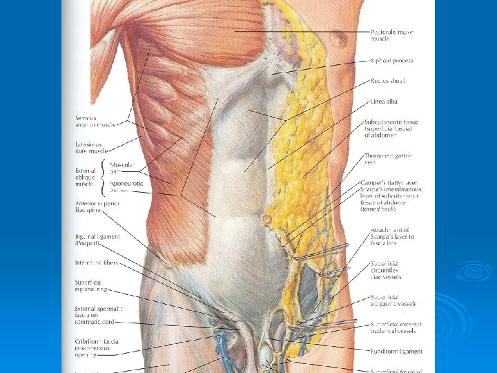 Blood Supply Ø Skin near the midline is supplied by branches of the superior epigastric artery (br. of int. thoracic artery) and the inferior epigastric artery ( br. of external iliac artery) Ø Skin of the flanks is supplied by branches from the intercostal, lumbar, and deep circumflex arteries