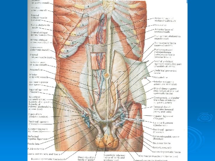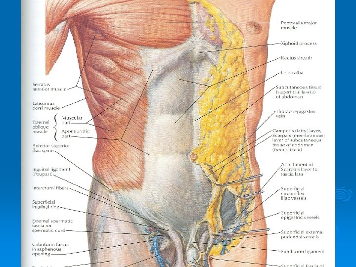 Superficial Fascia Ø Fatty layer or fascia of camper is continuous with the superficial fat over the rest of the body and may be extremely thick in obese patients Ø The membranous layer or scarpa’s fascia is thin and fades out laterally and above Ø Becomes continuous with the superficial fascia of the back and the thorax